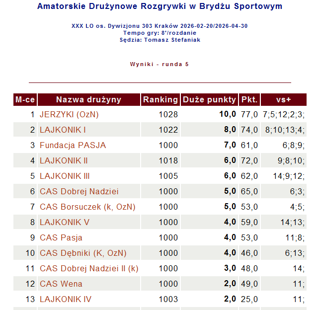 Aktualny harmonogram – aktualizacja od 13.04.2026 r. VICTORIA_04aPobierz Po rozegranych pięciu rundach (27.03.2026) „nasze” drużyny zajmują odpowiednio miejsca 1-sze (JERZYKI w składzie państwo Nowakowscy, Jerzy Bałon, Andrzej Myszka oraz 3-cie – państwo Koniuszy, Ewa Sadło, Andrzej Ślawski i Tomasz Stefaniak). SZCZEGÓLNIE POLECAMY: Turniej brydżowy _ 19_12_2025Pobierz REGULAMIN_VICTORIAPobierz
